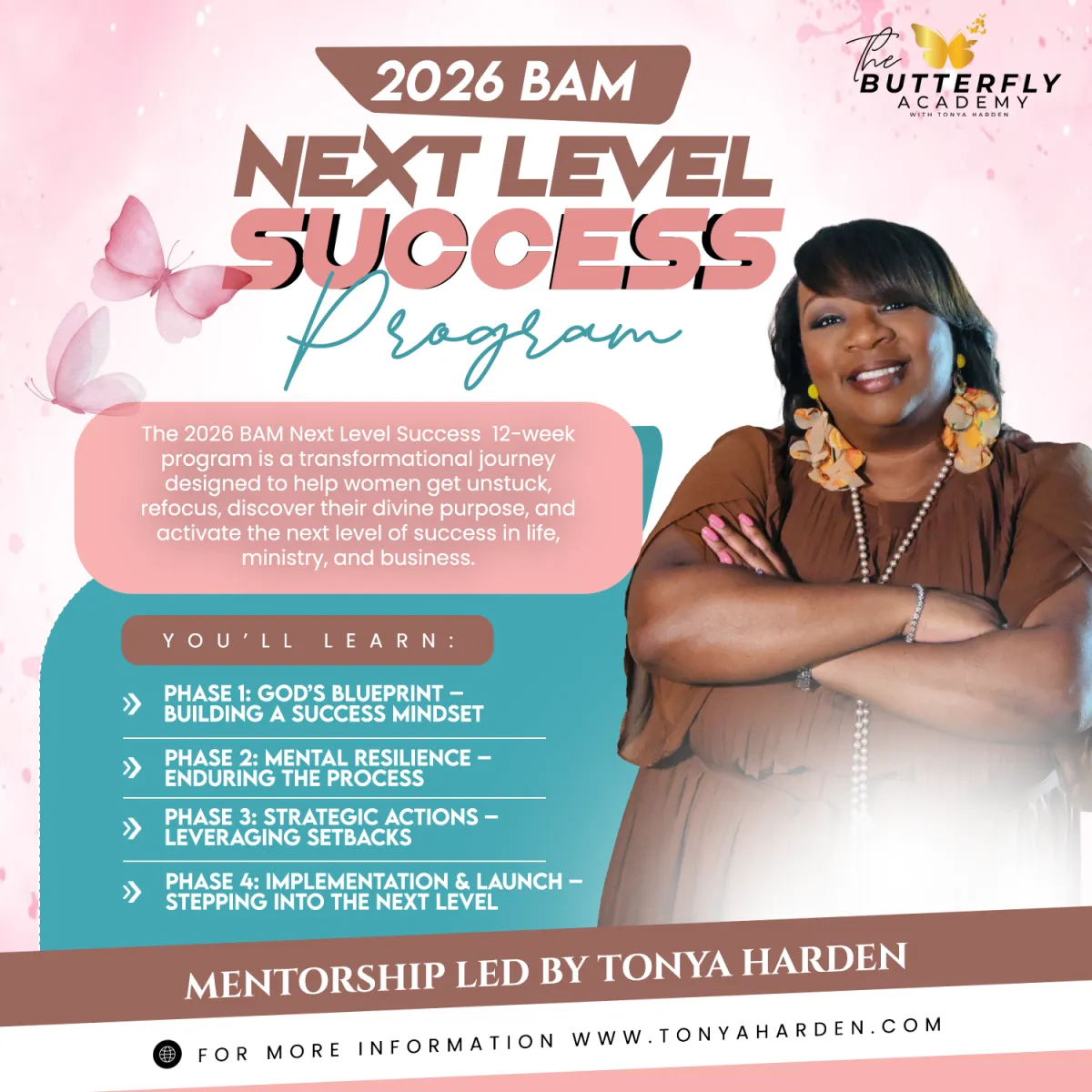 The Butterfly Academy Mentorship (BAM) Program is a transformative journey created for women who are ready to get unstuck and take action toward the vision God has placed in their hearts. Whether that vision is to start a business, launch a nonprofit, or birth a ministry, BAM provides the tools, guidance, and community you need to move forward with confidence.